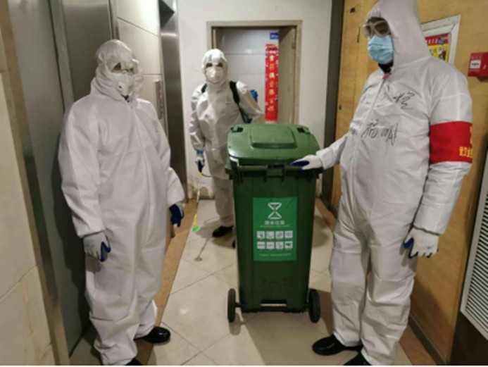 2月20日,集团机关突击队第八组接到八古墩社区的紧急工作任务,社区所辖顶琇晶城小区有两户确诊新型冠状病毒肺炎病人的衣服、床、棉被及生活物品需清理消毒。突击队第八组组长、共产党员甘李彪,突击队员谢福明、卢学军面对病毒危险,毫不畏惧,闻令而动,坚决服从社区指挥,在做好个人防护的前提下,协同社区工作人员先将患者丢弃物品集中进行初步消毒,然后将患者弃物打包装入垃圾桶,最大限度的减少患者物品携带病毒扩散到电梯等公共场所,切断疫情传播源。