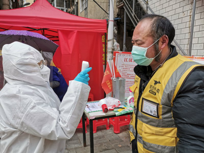 2月19日,集团机关突击队第三组队员郑金国、杨梦涯、周阳等3位同志值守唐家墩街西桥社区三眼桥一村。在上午劝返进出人员时,有一名居民未能出示保运行的工作证明且坚持外出,突击队员坚决阻止,并要求其配合测量体温,经连续几次测量,均显示发热。突击队员立即联系社区相关负责人及时赶到小区了解情况,在突击队员登记该居民姓名和联系方式后,社区安排其前往新华医院作检查。当天下午,突击队员郑金国主动联系该居民,得知医院诊断其左肺感染,为疑似病例,须立即隔离。突击队员立即报告组长曹华伟后通知社区,社区高度重视,要求该居民的妻子居家观察。2月20日,突击队员本着高度的责任感,继续跟踪病人妻子的健康状况,对其测量体温,在发现有发热症状后,立即报告小组长,并向社区相关负责人报告。社区高度警觉,当天中午,病人妻子就被社区工作人员带走隔离。