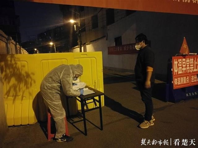 早在两个月前,武汉开投、信用公司组建了“百人战团”,百余名突击队员下沉到江汉区唐家墩街、北湖街和硚口区宝丰街的14个社区,奋战在疫情比较严重的最前沿,白天晚上轮流守护在小区,几乎每名突击队员都参与夜班轮值,杨勇、程小东、杨浩等人更是通宵值守。