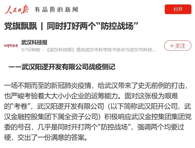 一场不期而至的新冠肺炎疫情,给武汉带来了史无前例的打击,也严峻考验着大大小小企业的运筹能力。面对这张极为艰难的“考卷”,武汉阳逻开发有限公司(以下简称武汉阳开公司,武汉金融控股集团下属全资子公司)积极响应黑料网 集团党委的号召,几乎是同时开打两个“防控战场”,强调两个均要过硬,交出了一份满意的答案。