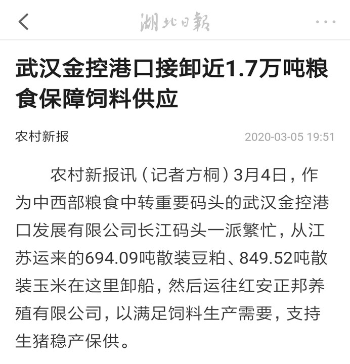 湖北日报:武汉金控港口接卸近1.7万吨粮食保障饲料供应