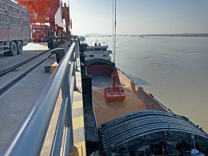 3月4日,作为中西部粮食中转重要码头的武汉金控港口发展有限公司长江码头一派繁忙,从江苏运来的694.09吨散装豆粕、849.52吨散装玉米在这里卸船,然后运往红安正邦养殖有限公司,以满足饲料生产需要,支持生猪稳产保供。