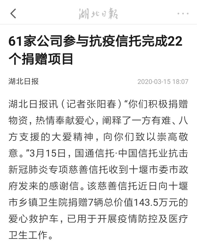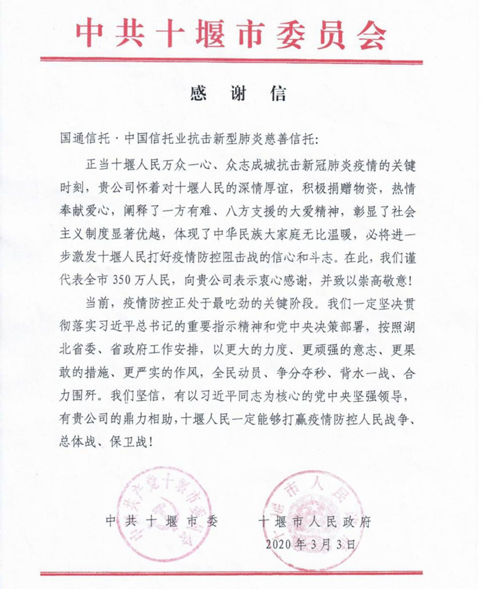 “你们积极捐赠物资,热情奉献爱心,阐释了一方有难、八方支援的大爱精神,向你们致以崇高敬意。”3月15日,国通信托·中国信托业抗击新冠肺炎专项慈善信托收到十堰市委市政府发来的感谢信。该慈善信托近日向十堰市乡镇卫生院捐赠7辆总价值143.5万元的爱心救护车,已用于开展疫情防控及医疗卫生工作。