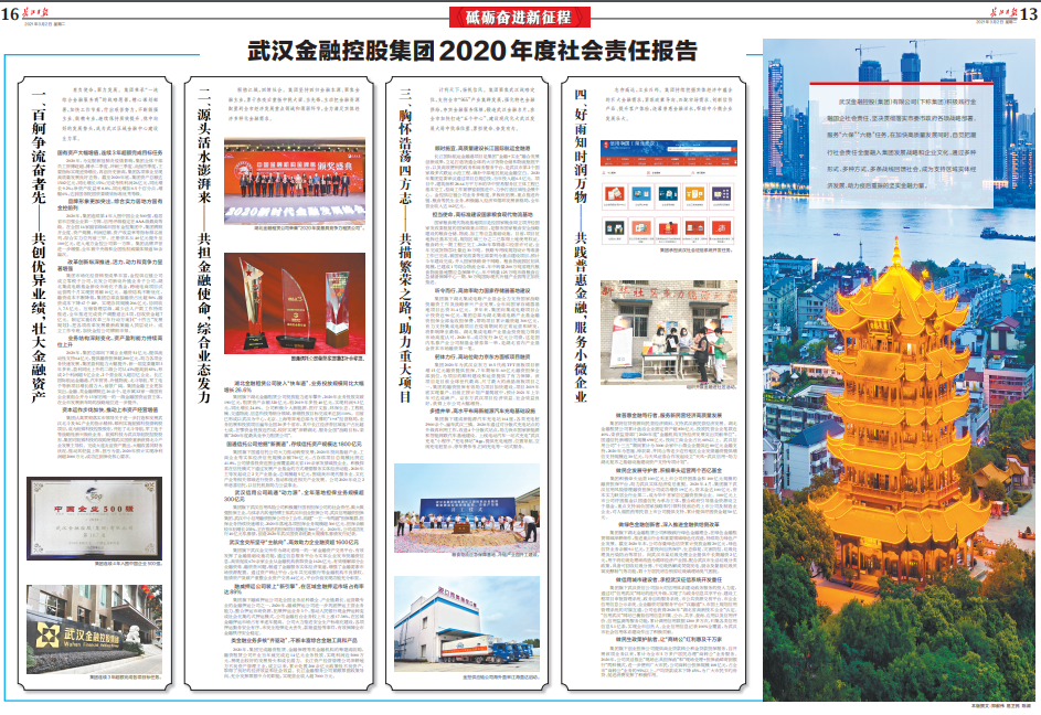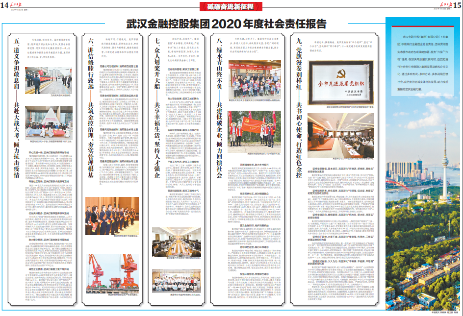 武汉金融控股(集团)有限公司(下称集团)积极践行金融国企社会责任,坚决贯彻落实市委市政府各项战略部署,服务“六保”“六稳”任务,在加快高质量发展同时,自觉把履行社会责任全面融入集团发展战略和黑料网,通过多种形式、多种方式、多条战线回馈社会,成为支持区域实体经济发展、助力疫后重振的坚实金融力量。