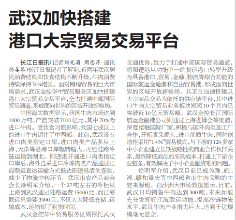 长江日报记者了解到,近两年武汉居民消费结构和饮食结构不断升级,牛肉消费持续保持30%增长。面对跨境贸易的巨大市场需求,武汉金控华中贸易服务区加快搭建港口大宗贸易交易平台,全力打通中部国际贸易通道,形成面向世界的区域开放新格局。