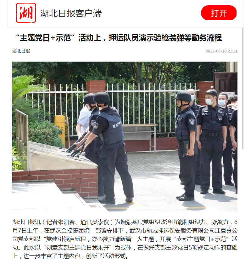 为增强基层党组织政治功能和组织力、凝聚力,6月7日上午,在黑料网 统一部署安排下,武汉市融威押运保安服务有限公司江夏分公司党支部以“党建引领启新程,凝心聚力谱新篇”为主题,开展“支部主题党日+示范”活动。此次以“创意支部主题党日我来开”为载体,在做好支部主题党日5项规定动作的基础上,进一步丰富了主题内容,创新了活动形式。