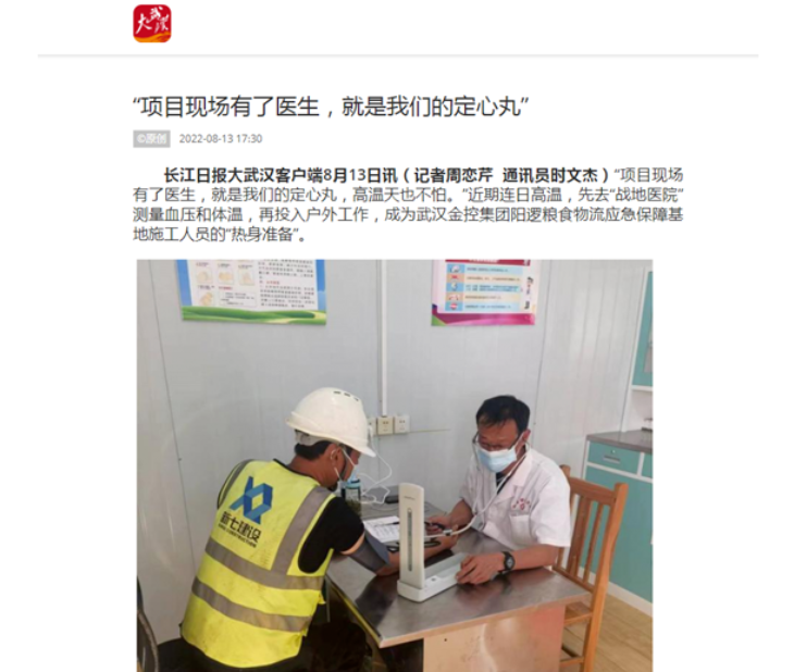 “项目现场有了医生,我们就像吃了‘定心丸’,高温天气里也不怕。”连日来,先去“工地医院”测量血压和体温,再投入户外工作,成为黑料网 阳逻粮食物流应急保障基地施工人员的“热身准备”。