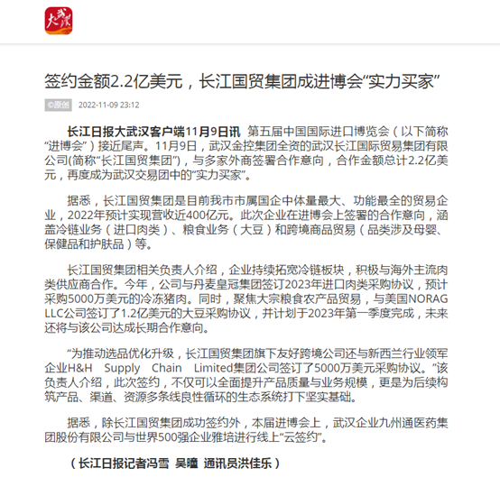 长江国贸集团相关负责人介绍,企业持续拓宽冷链板块,积极与海外主流肉类供应商合作。今年,公司与丹麦皇冠集团签订2023年进口肉类采购协议,预计采购5000万美元的冷冻猪肉。同时,聚焦大宗粮食农产品贸易,与美国NORAG LLC公司签订了1.2亿美元的大豆采购协议,并计划于2023年第一季度完成,未来还将与该公司达成长期合作意向。
