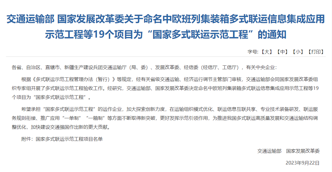 近日,交通运输部、国家发展改革委联合印发通知,决定命名19个项目为“国家多式联运示范工程”。其中由集团作为牵头单位联合长航货运有限公司和中铁武汉局集团有限公司,打造的长江经济带粮食物流核心枢纽与供应链金融服务平台多式联运示范项目位列其中。