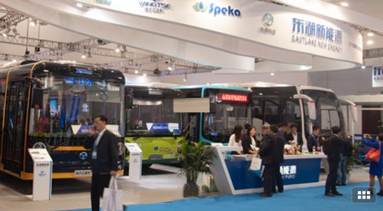 图四:东湖新能源汽车展位。左一为扬子江客车厂为2017年在摩洛哥召开的世界气象大会生产的新能源汽车样车。