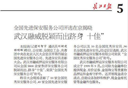10月18日上午,第四届全国先进保安服务公司、先进保安员表彰大会在北京人民大会堂隆重举行,武汉市融威押运保安服务有限公司荣获“全国十佳优秀保安服务公司”称号。