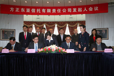 经过各发起人的充分讨论,会议审议并通过了公司章程,随后,各发起人共同签署了公司章程和投资入股协议等重要法律文件,标志着方正集团、东亚银行和武汉经发投三家企业集团经过一年多的努力,带着对中国信托业发展的良好预期,终于喜结良缘。